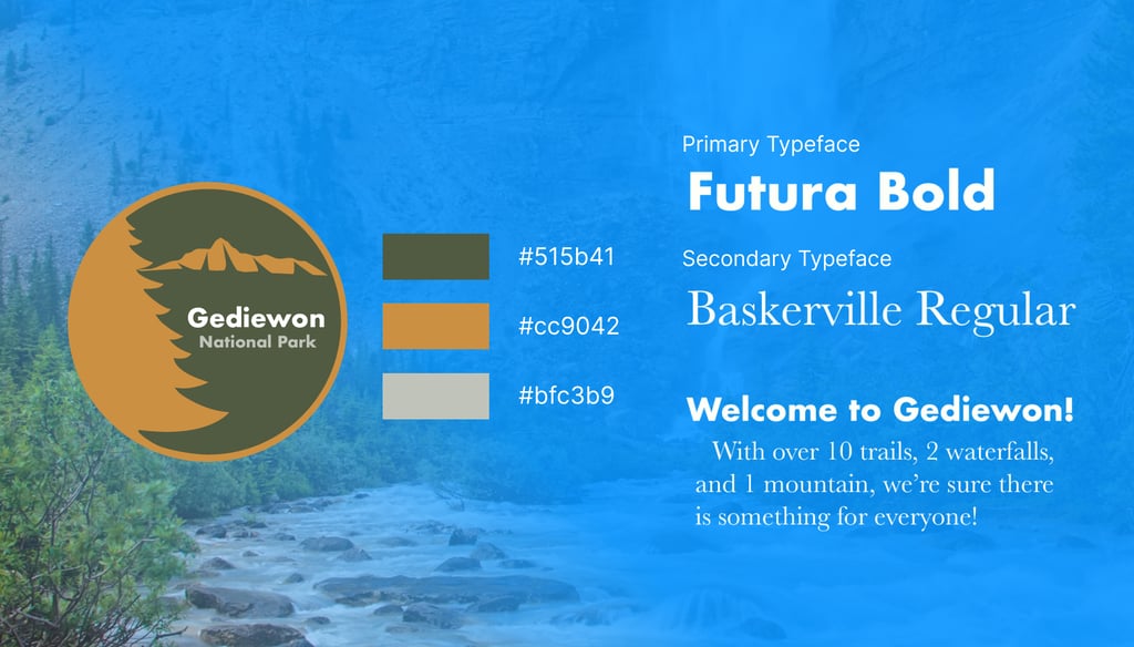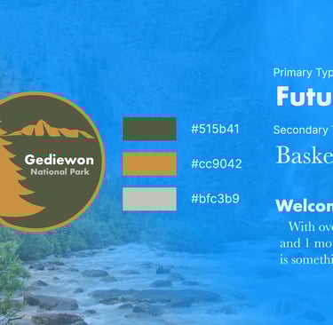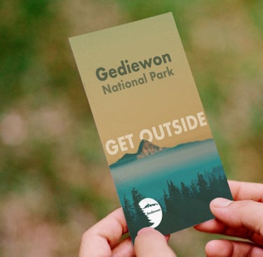 Conceptual nature reserve Gediewon Wilderness needed a rebrand as Gediewon National Park with a complete visual overhaul. The project included designing a new logo suite, creating a cohesive branding system with a three-color palette and typography, and developing five key collateral items: an advertising handout, building sign/café marker, business cards, trail sign, and a sticker. The goal was to create a fresh, modern identity that reflects the park’s natural beauty and spirit, ensuring all materials are visually consistent and aligned with the new brand.
