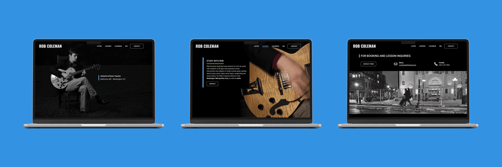 I designed and built a custom website and brand identity for Rob Coleman, a performing guitarist and music teacher in the Washington, D.C. area (who also happens to be my brother). The goal was to create a clean but "hand-made" feeling site, with minimal elements that put the spotlight on his music. To keep maintenance costs low without sacrificing quality, I chose to develop the site using Hostinger’s website builder, offering an efficient and sustainable solution for long-term use. I also created a new business card and brand guide to support a consistent visual identity across platforms.